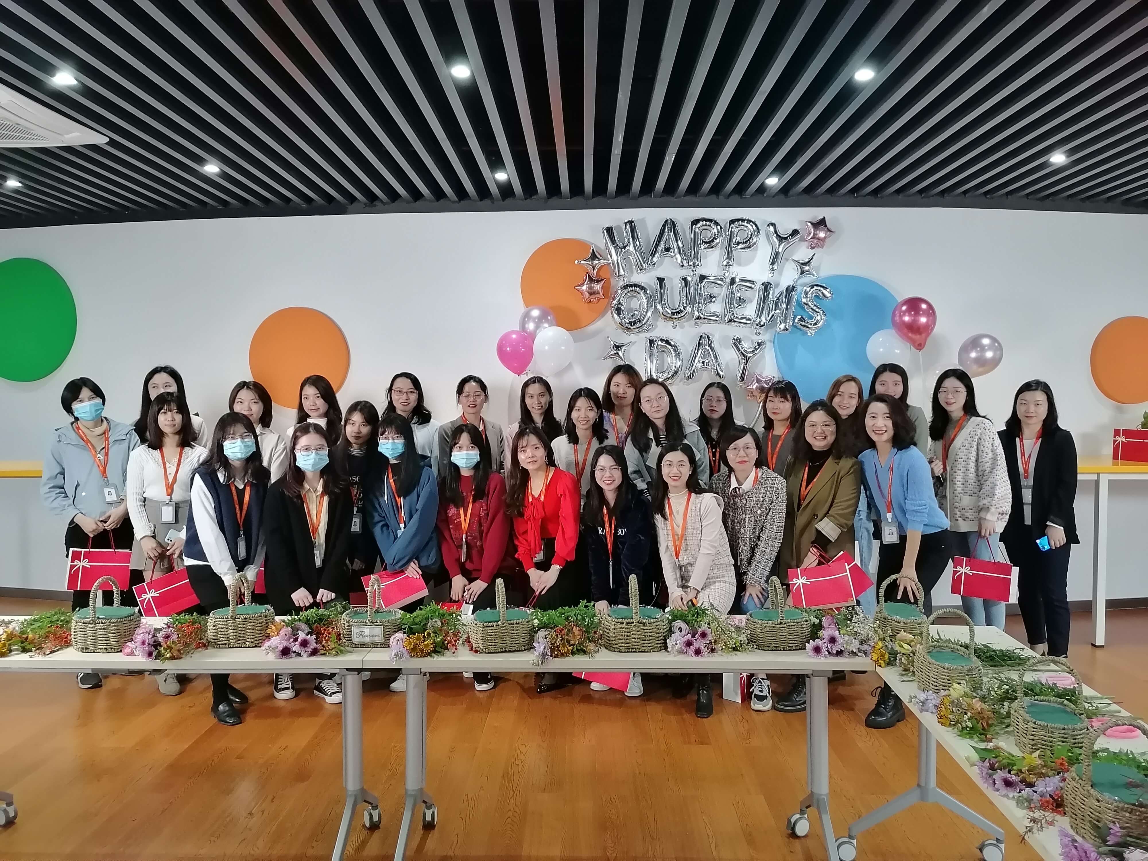 可爱的气球,精致的蛋糕甜点,新鲜的花材都准备就绪,中电港松山湖分部的主角们陆续登场。在派发心意小礼品后,在花艺师的带领下,港花们开始展现自己的艺术潜力,发挥对美的想象力,在一片欢声笑语中热火朝天的进行着自己的创作。 ![]()